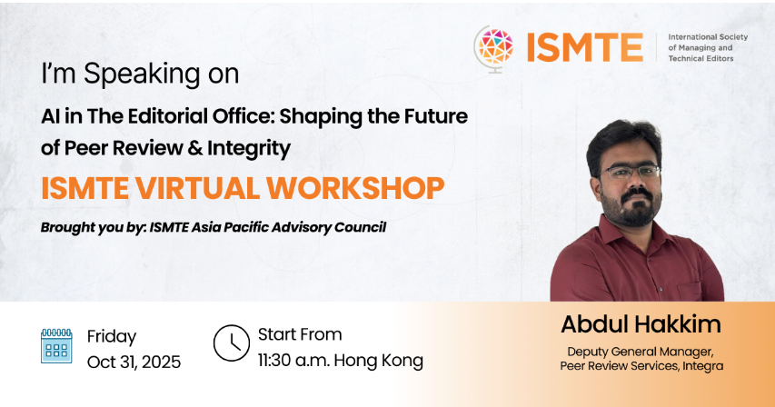 At the ISMTE Asia-Pacific 2025 Conference, Abdul Hakkim Sabibulla, Deputy General Manager at Integra, will speak on the evolving role of AI in editorial workflows. Hakkim leads key initiatives at the intersection of editorial operations and research integrity, focusing on integrating AI into publishing systems that support ethical peer review and transparent decision-making.