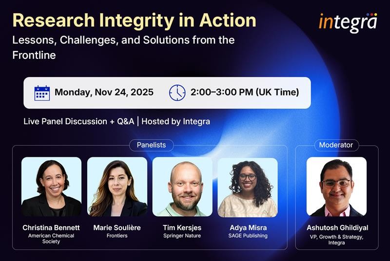 Join Integra and panelists from ACS, Frontiers, Springer Nature, and SAGE for a live discussion on building ethical, scalable editorial workflows, where AI supports, not replaces, human decisions.